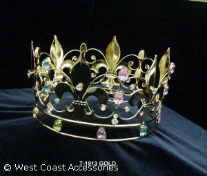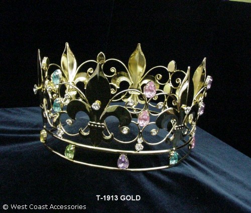 GOLD KING'S CROWN WITH LARGE COLOR RHINESTONE JEWELS. HEIGHT: 5" DIAMETER: 7 1/2"