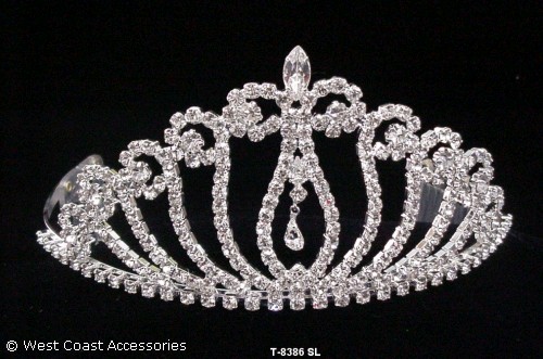 SILVER-PLATED RHINESTONE TIARA; WITH DANGLING TEARDROP IN THE CENTER.