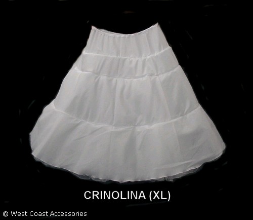 CRINOLINA(XL) DRAWSTRING-NYLON TAFETTA; WT UNDER-SKIRT HAS 3 RUFFLE (TULLE-UNDERSKIRT)FIRST TULLE32" SECOND HAS 2RUFFLE 14"(EACH)WAIST 46" DIA 55"
