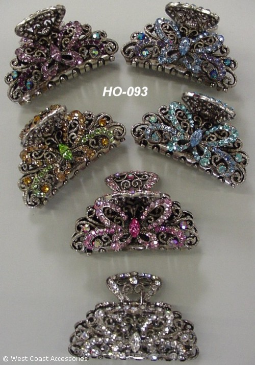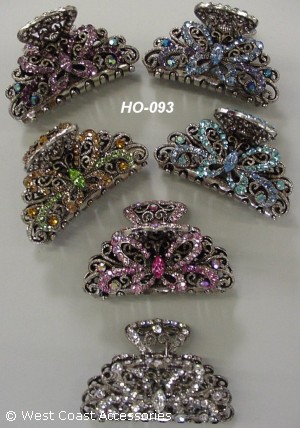 Hair clip in assorted colors. Available in aquamarine, lavendar/iridescent, lime green/topaz, pink combo, sapphire blue, and silver.