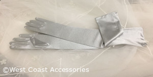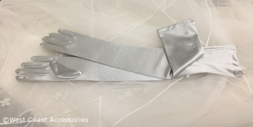 16BL Satin Gloves Adult Opera Length Silver. 23.5" long