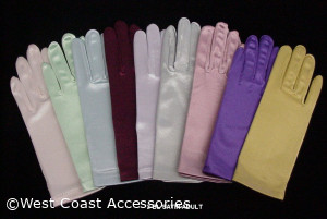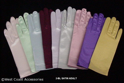 2BL Satin Gloves Adult. Wrist. 9" Available Color : White, Ivory, Black, Lavender, Dusty Rose, Royal Blue, Lt. Teal Green, Navy Blue, Burgundy, Lt. Gold, Fuchsia, Gold, Hunter Green, LT .Pink, Lt, Blue, Purple, Red, Silver.