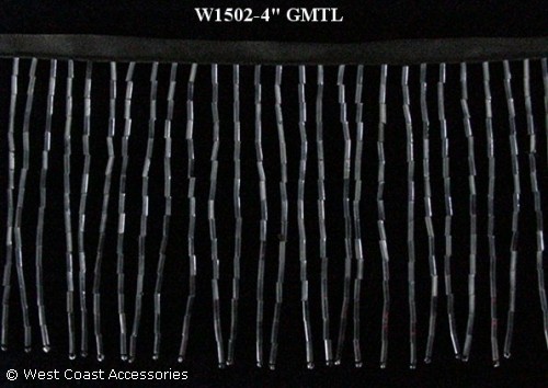 Gunmetal bugle beaded fringe. Four inches in length. Also available in two inches.