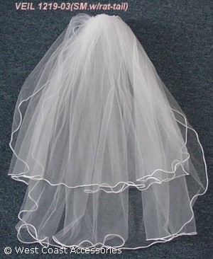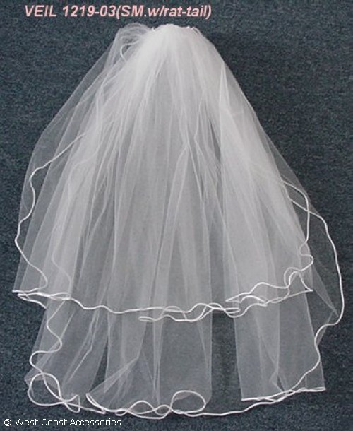 Small white 2-tier veil with rat tail satin edging. Also available in ivory. FIRST LAYER : 28" SECOND: 36"