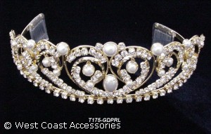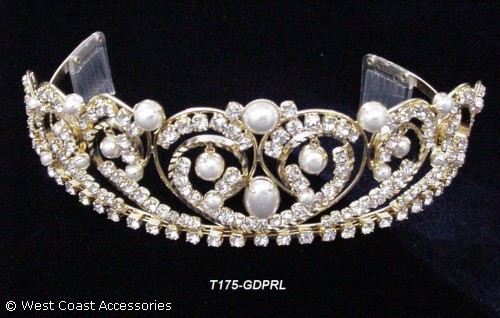 Gold rhinestone tiara with pearls. Also available in silver.