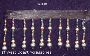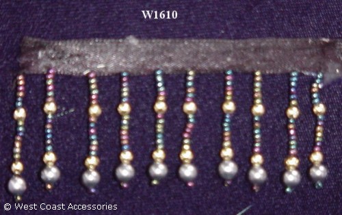 Black/iridescent, gunmetal, and gold beaded short fringe.