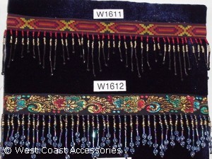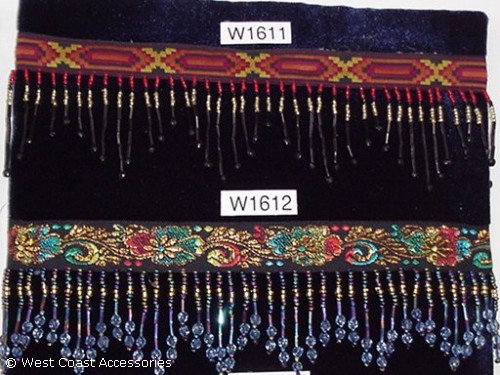 Gold/black/red and gold/black/multicolor zig-zag beaded fringe with ribbon.