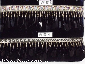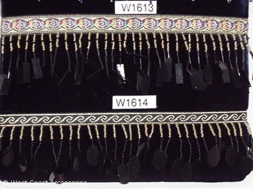 Gold/Black beaded fringe with rectangular or oval sequins and ribbon