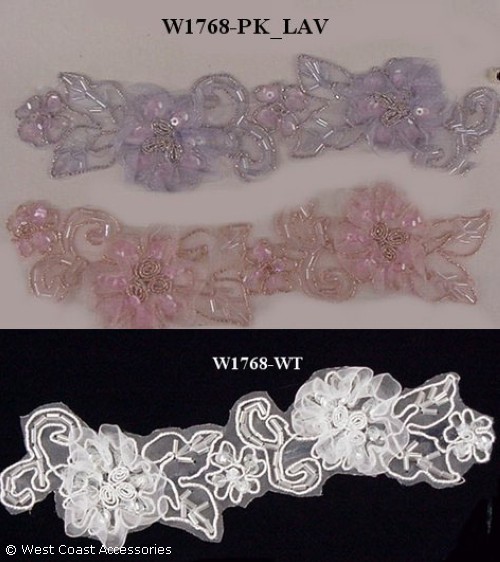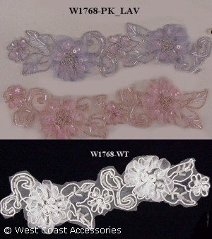 Pink, lavender, and white/silver beaded motif trim.