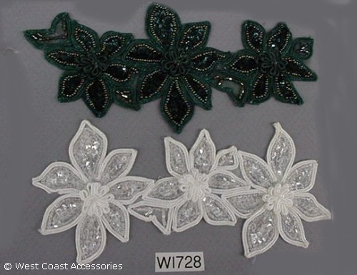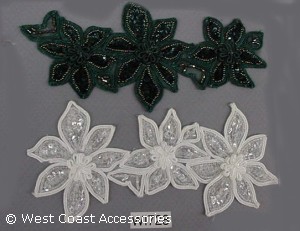 White and green beaded chorded flower motif trim. Also available in wine.