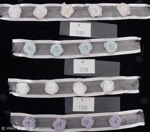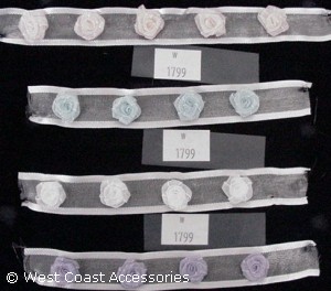 White ribbon trim with fabric rose motif. In white, pink, lavender, and light blue.