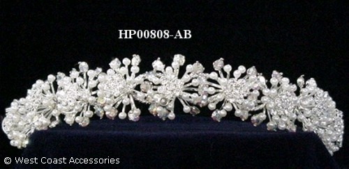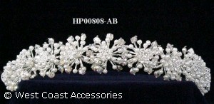SILVER RHINESTONE TIARA WITH PEARLS AND AB STONES.