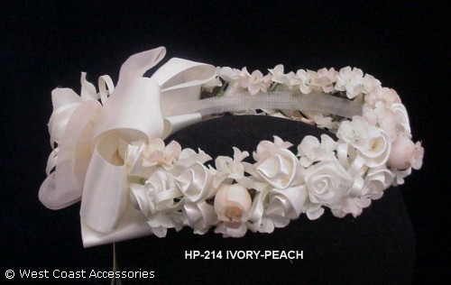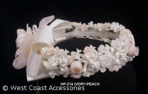 IVORY-PEACH BRIDAL/COMMUNION HEAPIECE WITH FLOWERS AND RIBBONS.