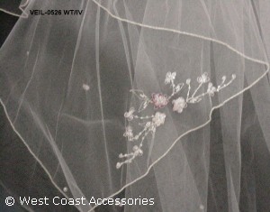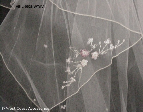 VEIL WITH BEADED DARK PINK AND WHITE FLOWERS. AVAILABLE IN WHITE ONLY. FIRST LAYER:30" SECON:34"