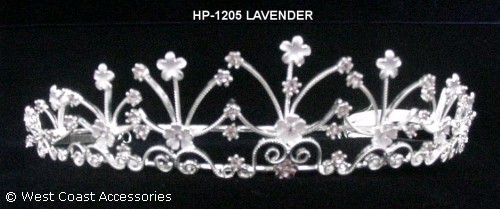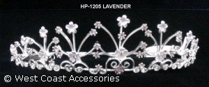 HEADPIECE WITH LAVENDER FLOWER DESIGNS AND LAVENDER RHINESTONES.